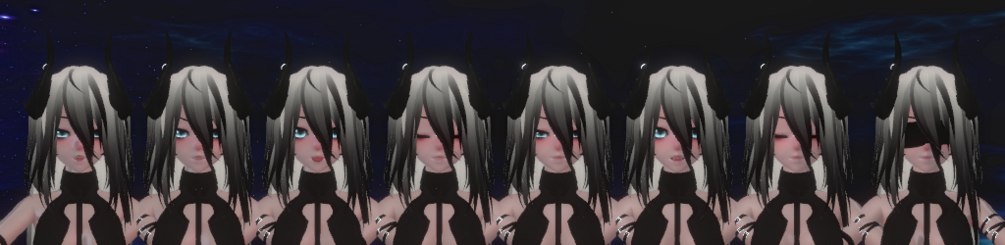 Hair, straps, outfit, horns/tail, stockings, mask, gems, glove, skirt, shoes.
